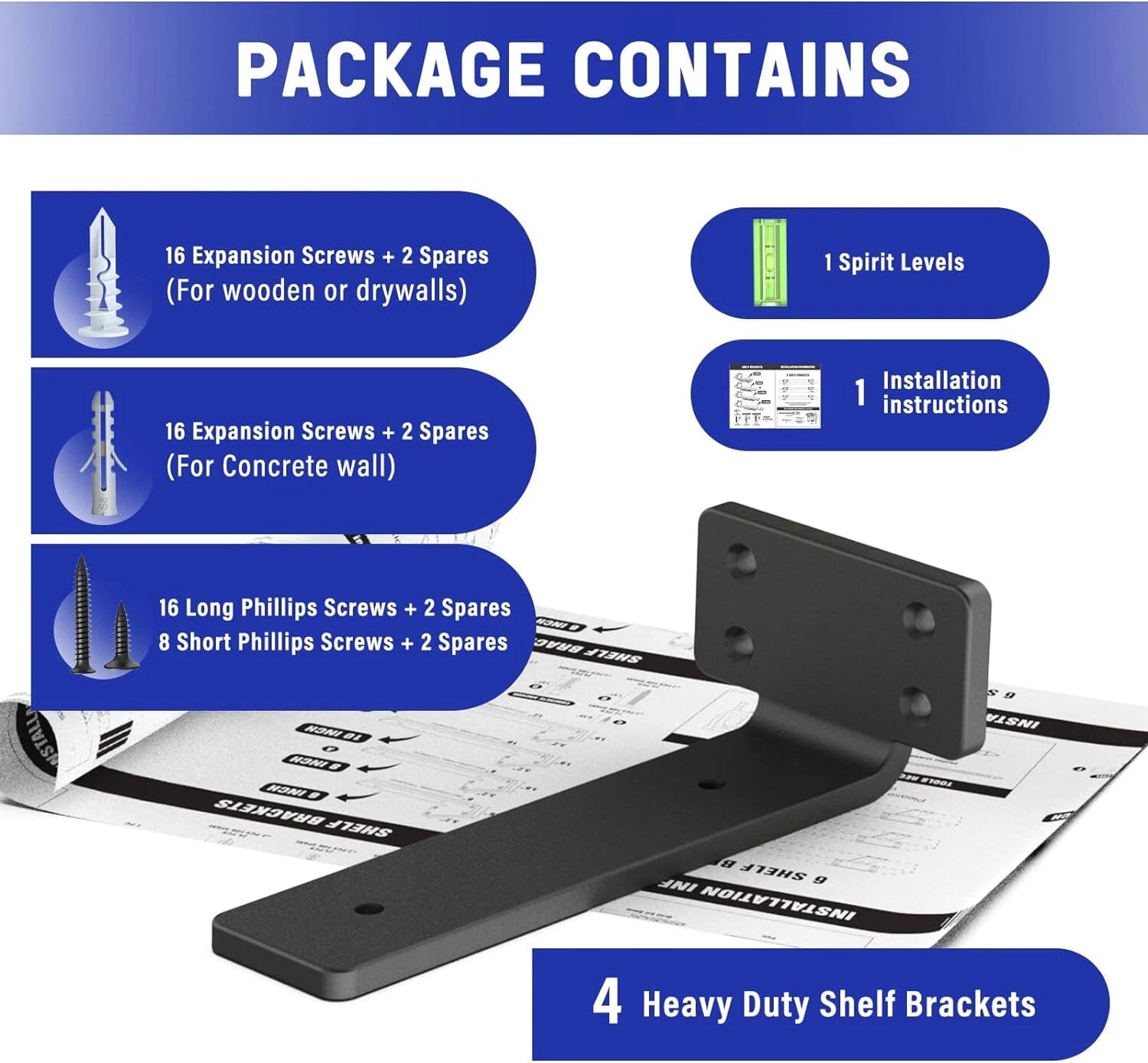 EASY TO INSTALL: Included are 4 black L-shaped brackets, 24 long screws for wall, 12 short screws for wood planks, 12 brick concrete anchors, which fit very nice and sturdy to keep your floating shelf brackets intact to complete the job to perfection (shelf not included).