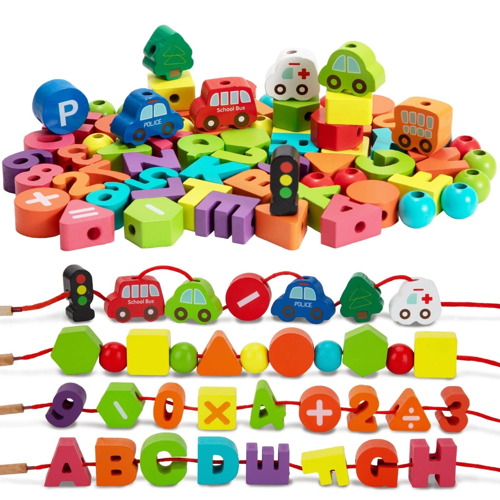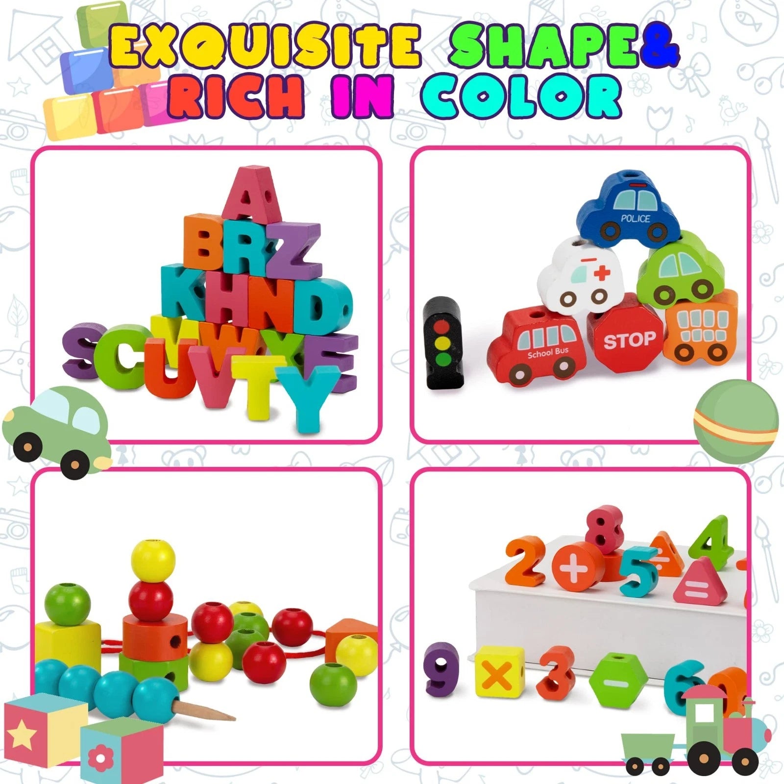 Children can use the beads for threading, stacking, building towers, sorting by color or shape, and even learning the alphabet and counting. The included wooden stick on the lace makes threading easier for small hands. With 4 laces and a drawstring storage bag, cleanup and travel are hassle-free.