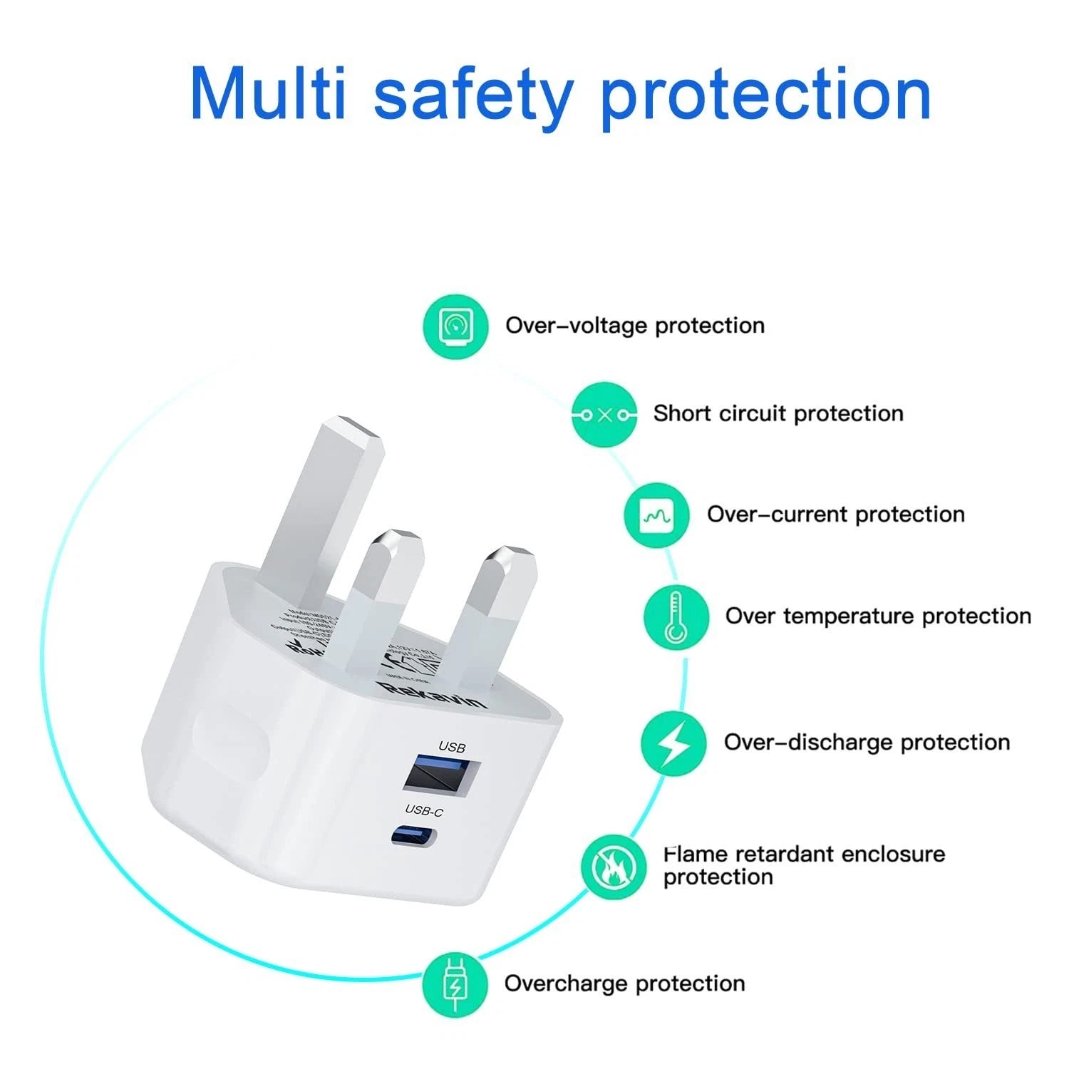 Crafted with a robust ABS+PC fire-resistant shell, this iPhone fast charger features built-in multiple safety protections. It automatically matches the optimal current required by your device, protecting against short circuits, overheating, overcurrent, and overcharging, ensuring your devices remain safe during charging.